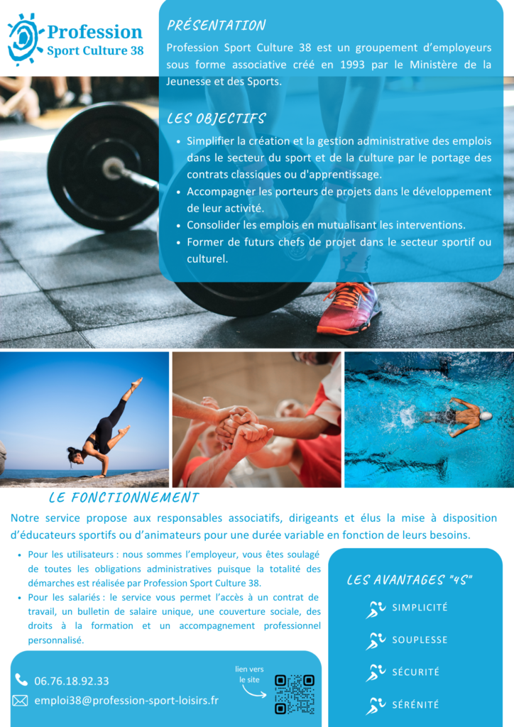 Pour les utilisateurs, nous sommes l’employeur, vous êtes soulagé de toutes les obligations administratives, la totalité des démarches liées à l’emploi et l’ensemble des documents obligatoires sont réalisés par Profession Sport Culture 38.
